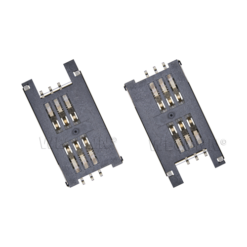 Product name: SIM card connector flip type 6pin(2.9H) Part Number:WL-SIM180-099 Specification:Plastic: black high temperature UL94V-0; terminal: copper alloy; shell: stainless steel