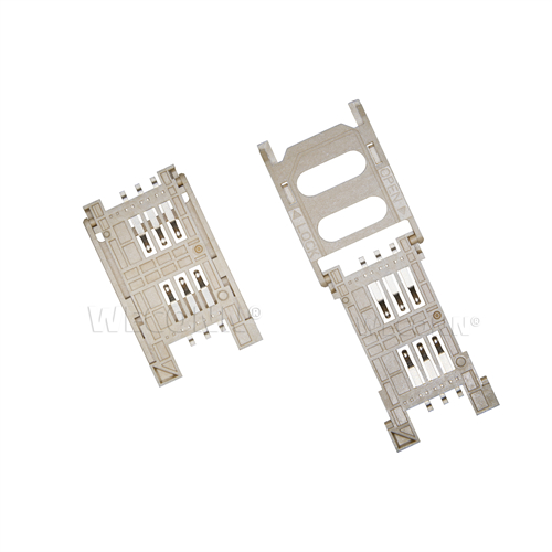 Product name: SIM card connector flip type 6pin(2.5H) Part Number:WL-SIM521-06-NA1(with positioning column) Specification:Plastic: white high temperature UL94V-0; terminal: copper alloy; shell: stainless steel