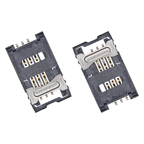 Product name: SIM card connector flip type 6pin(2.5H) Part Number:WL-SIM705-003 Specification:Plastic: black high temperature UL94V-0; terminal: copper alloy; shell: stainless steel