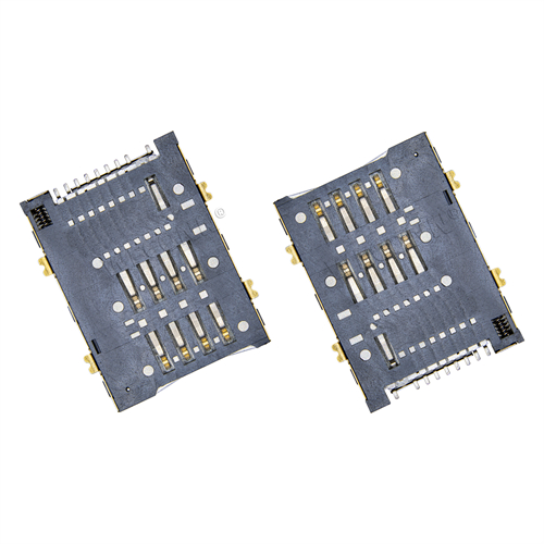 Product name:SIM card connector push push type No positioning post 9pin(1.93H) Part Number:WL-SIM193-09A-NA0 Specification:Plastic: black high temperature UL94V-0; terminal: copper alloy; shell: stainless steel