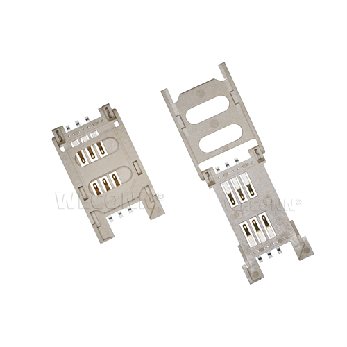 Product name: SIM card connector flip type 6pin(2.5H) Part Number:WL-SIM521-06-NA1(with positioning column) Specification:Plastic: white high temperature UL94V-0; terminal: copper alloy; shell: stainless steel