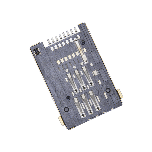 Product name: SIM card connector push push type6+2pin(2.2H) Part Number:WL-SIM225-109-NA1 Specification:Plastic: black high temperature UL94V-0; terminal: copper alloy; shell: stainless steel
