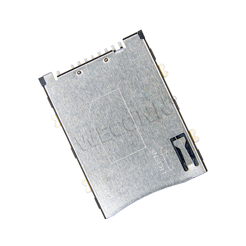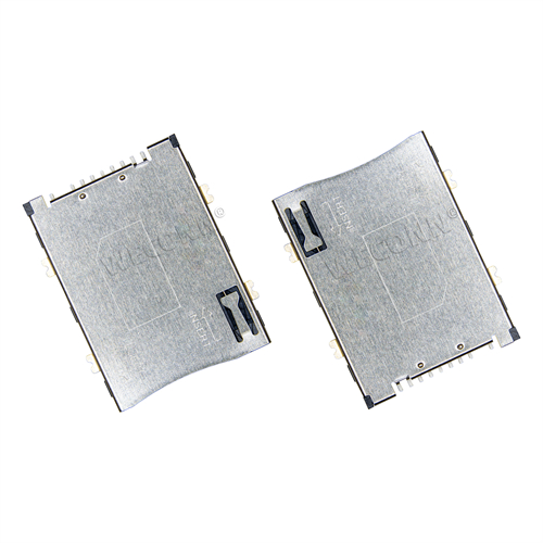 Product name:SIM card connector push push type No positioning post 9pin(1.93H) Part Number:WL-SIM193-09A-NA0 Specification:Plastic: black high temperature UL94V-0; terminal: copper alloy; shell: stainless steel